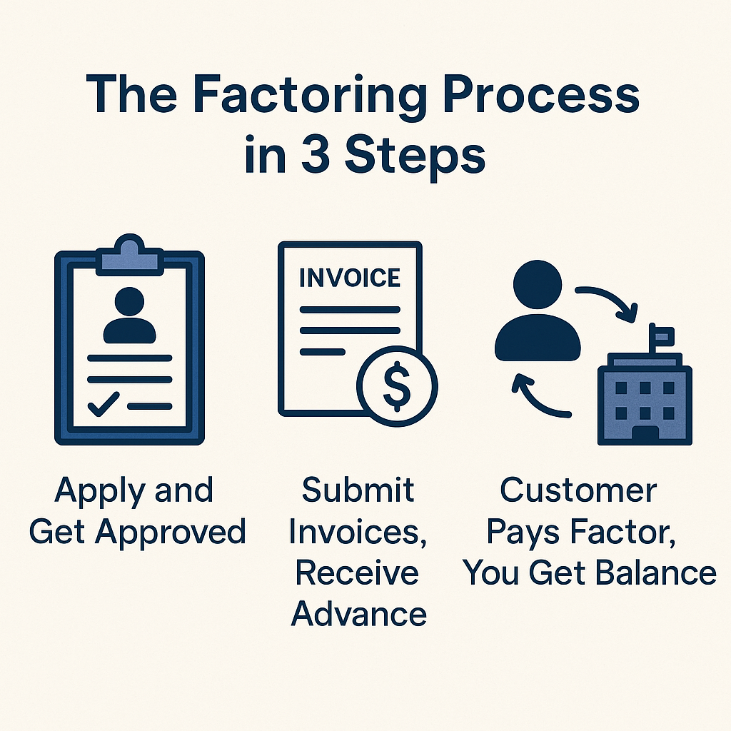 The factoring process has three steps. These are application and approval, invoice submission and funding, and collection and payment. Businesses should choose a factoring company based on various criteria including fees and customer service in the invoice factoring process.